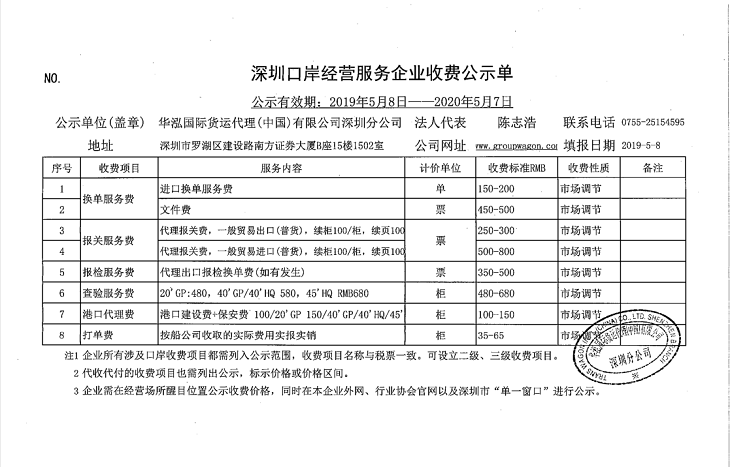 华泓国际货运代理(中国)有限公司深圳分公司收费目录清单