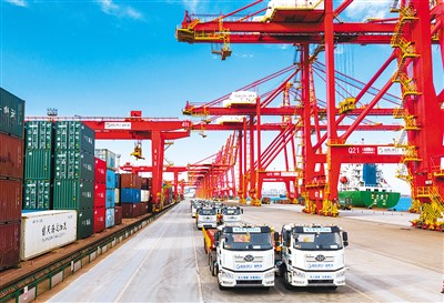 无人集卡在山东港口日照港顺岸开放式全自动化集装箱码头现场作业。该码头首次将“5G+北斗”和国产码头操作系统应用到全自动化集装箱作业全过程,实现了自动化轨道吊“少跑路”、集卡车在堆场“自由行”。张进刚 摄(人民视觉)